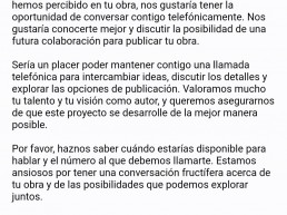 Ahí, con cierta confianza, ya sí que comuniqué a mis allegados la buena nueva de que había recibido interés por parte de una editorial con buena pinta. Les envíe el pantallazo que abre este post y les expliqué que estaba a la espera de saber cuál era esa propuesta. Entusiasmo on…
